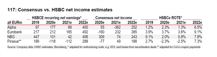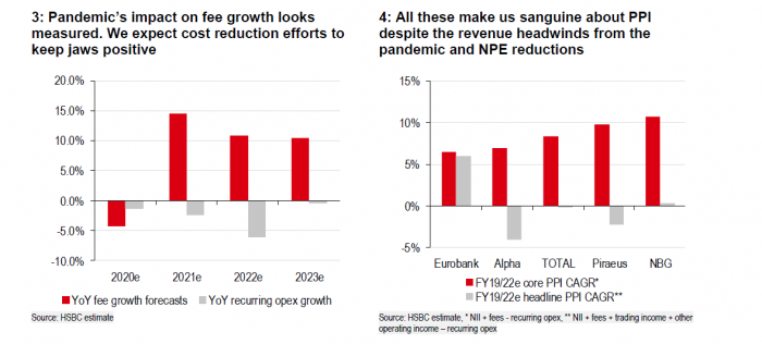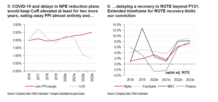 Ο παραπάνω συνδυασμός οδηγεί στο συμπέρασμα ότι «οι ελληνικές τράπεζες, με εξαίρεση την Eurobank να εμφανίσουν χαμηλή κερδοφορία για το 2020 και το 2021, ενώ η ανάκαμψή της θα είναι σταδιακή για τα έτη 2022 και 2023 όταν δηλαδή θα έχει ξεπεραστεί η επίπτωση από την πανδημία».