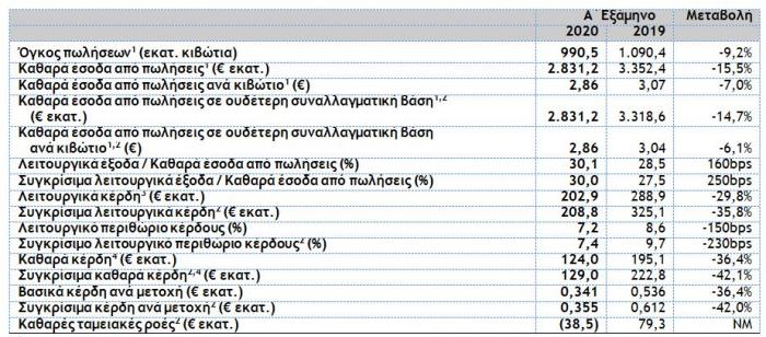 Τα έσοδα σε ουδέτερη συναλλαγματική βάση υποχώρησαν κατά 14,7%, με τον όγκο πωλήσεων μειωμένο κατά 9,2% και τα έσοδα ανά κιβώτιο σε ουδέτερη συναλλαγματική βάση μειωμένα κατά 6,1%, καθώς η πανδημία είχε σημαντικό αντίκτυπο στο κανάλι εκτός σπιτιού, οδηγώντας σε χαμηλότερο όγκο πωλήσεων, με το μεγαλύτερο μέρος της πτώσης να προέρχεται από τις συσκευασίες άμεσης κατανάλωσης, γεγονός που επηρέασε με την σειρά του αρνητικά το μείγμα τιμών.