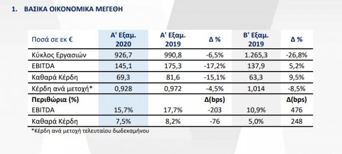 O κύκλος εργασιών διαμορφώθηκε σε €926,7 εκ. έναντι €990,8 εκ. την αντίστοιχη περίοδο του 2019, σημειώνοντας μείωση 6,5% που οφείλεται κυρίως στο αδύναμο περιβάλλον τιμών των Τομέων της Μεταλλουργίας και της Ενέργειας. Τα λειτουργικά κέρδη προ φόρων, τόκων και αποσβέσεων (EBITDA), διαμορφώθηκαν σε €145,1 εκ. έναντι €175,3 εκ. την αντίστοιχη περίοδο του 2019.