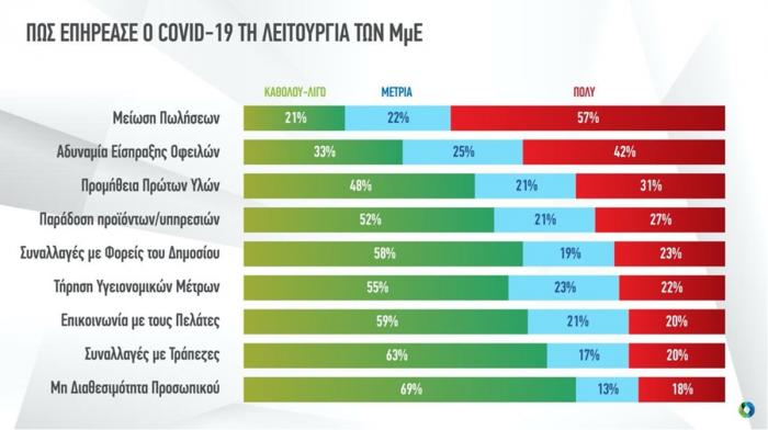 • Η κρίση του κορονοϊού επηρέασε σημαντικά το 80% των μικρομεσαίων επιχειρήσεων στην Ελλάδα, με το 37% να αναγκάζεται να προχωρήσει σε πλήρη αναστολή λειτουργίας. Το 16% διεκπεραίωνε την πλειονότητα των εργασιών απομακρυσμένα, ενώ το 17% κατέγραψε μείωση των πωλήσεων και των συναλλαγών.