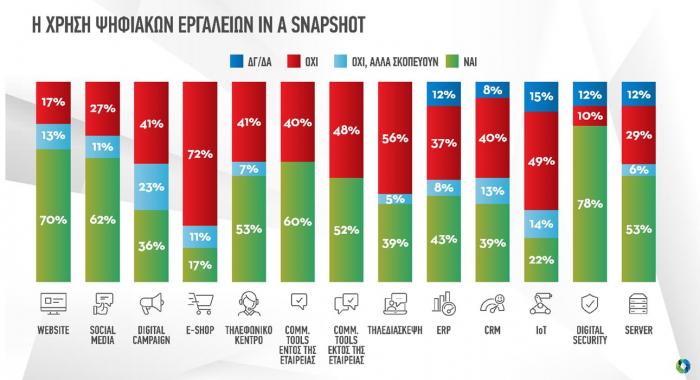 Ειδικότερα, από την έρευνα «Η Ψηφιακή Ετοιμότητα των Μικρών & Μικρομεσαίων Επιχειρήσεων στην Ελλάδα - H επίδραση του COVID-19» προκύπτει ότι το 50% των μικρών και μικρομεσαίων επιχειρήσεων βρίσκονται στα πρώτα στάδια ψηφιακής ανάπτυξης.