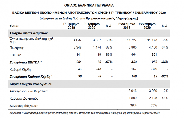 Έντονα δυσμενής ήταν η επίδραση της πανδημίας και των περιοριστικών μέτρων στα οικονομικά μεγέθη τόσο γ' τριμήνου όσο και του εννεάμηνου των ΕΛΠΕ, καθώς αντιμετώπισε το χειρότερο περιβάλλον διύλισης στην ιστορία, ενώ υπήρξε σημαντική πίεση στις πωλήσεις.
