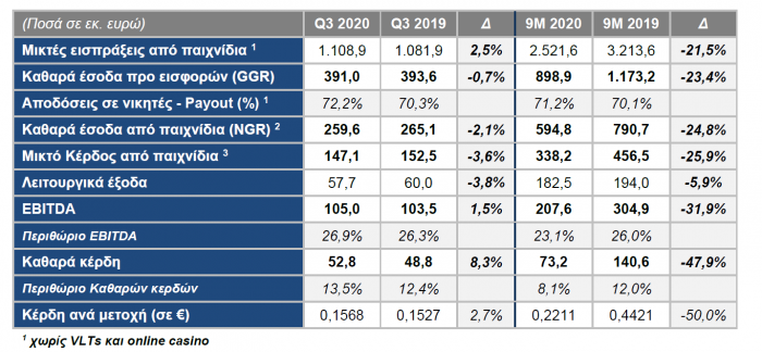 Σύμφωνα με την ανακοίνωση του ομίλου τα καθαρά έσοδα προ εισφορών (GGR) εννεαμήνου 2020 διαμορφώθηκαν στα €898,9εκ. μειωμένα κατά 23,4% σε ετήσια βάση και στο γ’ τρίμηνο 2020 στα €391,0εκ., ελαφρώς μειωμένα κατά 0,7% σε σχέση με την αντίστοιχη περίοδο πέρυσι, τείνοντας σταδιακά στην επιχειρησιακή κανονικότητα.