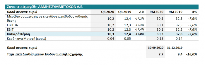 Τα ενοποιημένα καθαρά κέρδη το 3ο τρίμηνο 2020 ανήλθαν σε 20,1 εκατ. ευρώ, μειωμένα κατά 17,2% έναντι 24,2 εκατ. το 2019, ενώ τα συγκρίσιμα καθαρά κέρδη διαμορφώθηκαν στα 22,7 εκατ. ευρώ, έναντι 22,6 εκατ. ευρώ το προηγούμενο έτος σημειώνοντας άνοδο 0,4%.