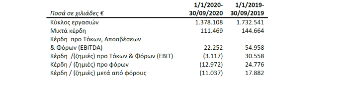 Όπως τονίζεται στην ανακοίνωση της εταιρείας ο μεικτός κύκλος εργασιών για τους πρώτους εννέα μήνες του 2020 διαμορφώθηκε στο ποσό των € 1.378 εκατ. μειωμένος κατά € 354 εκατ. σε σχέση με το αντίστοιχο εννεάμηνο του 2019, παρουσιάζοντας ποσοστιαία μείωση της τάξεως του 20%.