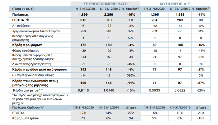 Ανθεκτικότητα σε μια πολύ δύσκολη συγκυρία παρουσίασε το 2020 η Mytilineos πετυχαίνοντας μικρή αύξηση κατά 1% των κερδών τόκων και αποσβέσεων (ΕΒΙΤDΑ), στα 315 εκατ. ευρώ επωφελούμενα από την ισχυρή επίδοση του Τομέα Ηλεκτρικής Ενέργειας & Φυσικού Αερίου, ενώ τα καθαρά κέρδη διαμορφώθηκαν στα 129 εκατ. σημειώνοντας υποχώρηση κατά 11%.