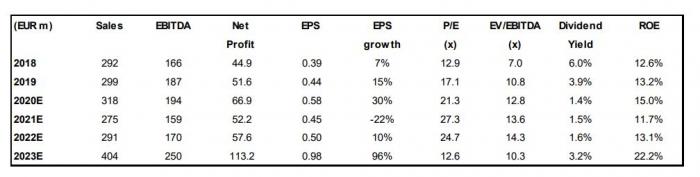 Η Terna Energy USΑ δεν περιλαμβάνεται πλέον στο μοντέλο μας, αλλά παρόλα αυτά διατηρούμε τη σύσταση ΑΓΟΡΑΣ για τη μετοχή της ΤΕΡΝΑ ΕΝΕΡΓΕΙΑΚΗ και αυξάνουμε την τιμή στόχο από τα 14,8 ευρώ / μετοχή σε 17,6 ευρώ / μετοχή, υποδηλώνοντας αύξηση 43% σε σχέση με την τρέχουσα τιμή της μετοχής.