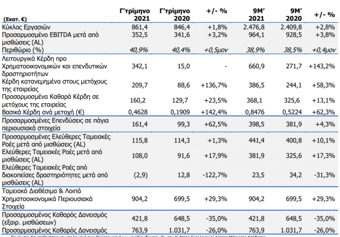 Οι ελεύθερες ταμειακές ροές ανήλθαν σε 108 εκατ. ευρώ, αυξημένες κατά 16,4 εκατ. ευρώ σε ετήσια βάση, λόγω χαμηλότερου φόρου εισοδήματος, εξόδων από τόκους και πληρωμών που σχετίζονται με προγράμματα εθελούσιας αποχώρησης. Ο προσαρμοσμένος καθαρός δανεισμός του Ομίλου στις 30 Σεπτεμβρίου 2021 ήταν 763,9 εκατ. ευρώ, μειωμένος κατά 26% σε σχέση με τις 30 Σεπτεμβρίου 2020. Ο προσαρμοσμένος καθαρός δανεισμός του Ομίλου αντιστοιχεί σε 0,6 φορές το ετήσιο προσαρμοσμένο ΕΒΙTDA (AL).