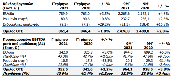 Ενισχυμένα εμφανίζονται τα μεγέθη του ΟΤΕ στο εννεάμηνο του 2021 με τα ενοποιημένα έσοδα του ομίλου να παρουσιάζουν αύξηση 1,8% στο γ' τρίμηνο του 2021 καθώς διαμορφώθηκαν στα 861,4 εκατ. ευρώ. Στην Ελλάδα, τα έσοδα αυξήθηκαν κατά 3,5%, στα 789,9 εκατ. ευρώ, στηριζόμενα από την ανάκαμψη στον τουρισμό και τη σταθερή ζήτηση για υψηλότερες ταχύτητες στη σταθερή και δεδομένα στην κινητή.