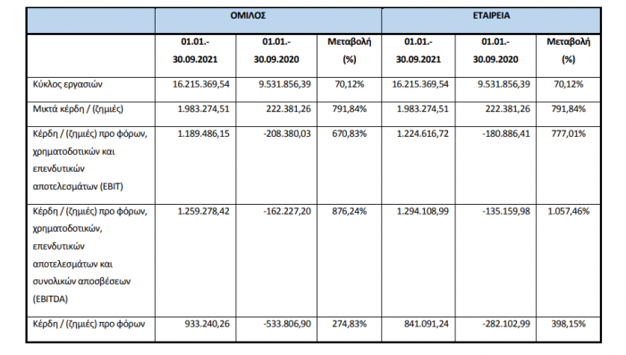 Τα αποτελέσματα προ φόρων, χρηματοοικονομικών, επενδυτικών αποτελεσμάτων και αποσβέσεων, σε ενοποιημένη βάση, διαμορφώθηκαν σε κέρδη ποσού 1.259.278,42 ευρώ έναντι ζημιών ποσού 162.227,20 ευρώ το αντίστοιχο εννεάμηνο του 2020. Η μεταβολή είναι απόρροια της μεταβολής των μικτών κερδών.
