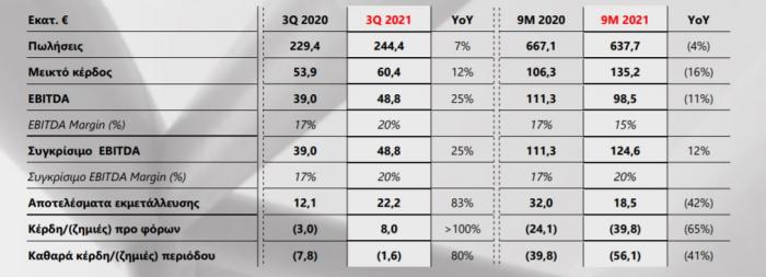 Στο εννεάμηνο του 2021 τα συγκρίσιμα EBITDA διαμορφώθηκαν στα 125 εκατ. ευρώ, αυξημένα κατά 12% σε σχέση με το εννεάμηνο του 2020 που ήταν στα 111 εκατ. ευρώ. Τα κέρδη προ φόρων, τόκων και αποσβέσεων (EBITDA), ανήλθαν σε 98,5 εκατ. ευρώ έναντι 111 εκατ. ευρώ το αντίστοιχο διάστημα το προηγούμενο έτος. Το συγκρίσιμο περιθώριο EBITDA στο εννεάμηνο του 2021 αλλά και στο Γ’ Τρίμηνο 2021 διαμορφώθηκε σε 20% έναντι 17% την αντίστοιχη περίοδο πέρυσι, ενώ το περιθώριο EBITDA συμπεριλαμβανομένης της πρόβλεψης των 26 εκατ. ευρώ διαμορφώθηκε σε 15%.