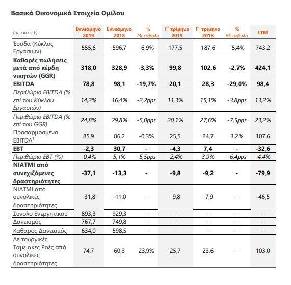 Ειδικότερα, κατά το εννεάμηνο του 2019, τα έσοδα του Ομίλου Intralot διαμορφώθηκαν στα €555,6 εκατ. παρουσιάζοντας μείωση 6,9% σε ετήσια βάση. Τα κέρδη EBITDA για την ίδια περίοδο διαμορφώθηκαν στα €78,8 εκατ. (-19,7% σε ετήσια βάση), με το προσαρμοσμένο EBITDA να παραμένει σχετικά σταθερό στα €85,9 εκατ. (-0,3% σε ετήσια βάση).