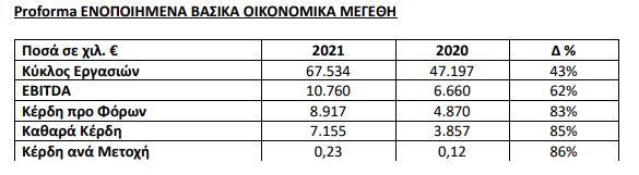Παράλληλα είχε 62% αύξηση των Κερδών προ Φόρων τόκων και αποσβέσεων (EBITDA) στα €10,76 εκατ., έναντι €6,66 εκατ. το 2020, καθώς και 85% αύξηση των Κερδών μετά από Φόρους στα € 7,15 εκατ. έναντι €3,86 εκατ. το 2020.