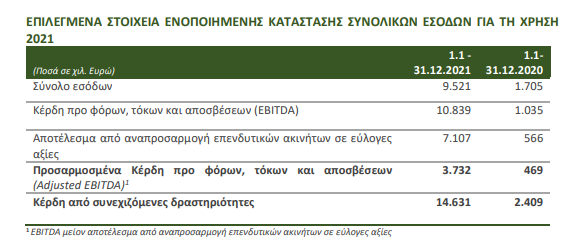 - Τα αποτελέσματα του 2021 δεν είναι πλήρως αντιπροσωπευτικά της δυναμικότητας του υφιστάμενου χαρτοφυλακίου καθώς τα αποτελέσματα των θυγατρικών που αποκτήθηκαν κατά τη διάρκεια του 2021 περιλαμβάνονται στα ενοποιημένα αποτελέσματα του Ομίλου από την ημερομηνία απόκτησης τους, ήτοι από τις 29/6 για τις εταιρίες που εισφέρθηκαν στο πλαίσιο της ΑΜΚ και από τις 30/11 για τις ιδιοκτήτριες εταιρίες του ακινήτου εξυπηρετούμενων διαμερισμάτων στον Πειραιά.