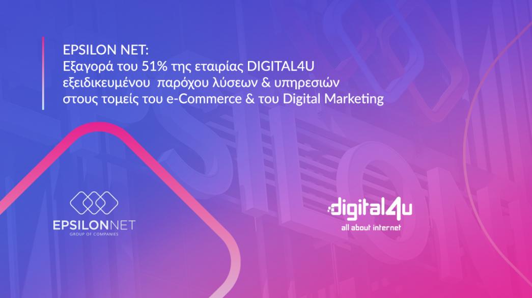 Η Epsilon Net ανακοινώνει την απόκτηση (πλειοψηφικού) ποσοστού 51% στην εταιρία με την επωνυμία «Digital4u ανώνυμη εταιρεία παροχής υπηρεσιών διαδικτύου πληροφορικής και διαφήμισης» και το διακριτικό τίτλο «DIGITAL4U», η οποία δραστηριοποιείται στο χώρο του e-Commerce & Digital marketing (www.digital4u.gr).
