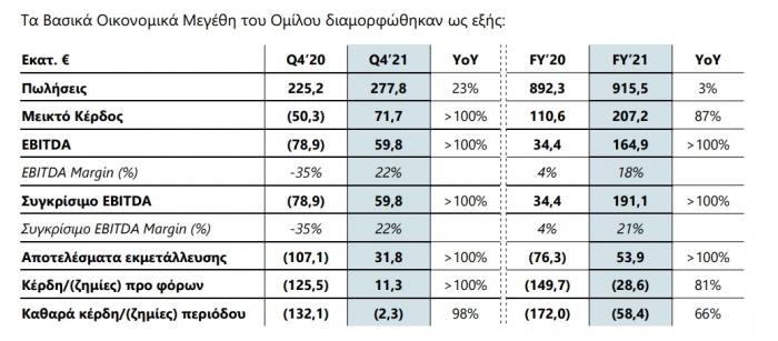 Λειτουργικά Κέρδη (ΕΒΙΤ) για τη χρήση 2021 ύψους €53,9 εκατ. έναντι ζημιών €76,3 εκατ. στη χρήση 2020. Κέρδη προ φόρων ύψους €11,3 εκατ. για τον Όμιλο στο Δ’ τρίμηνο 2021, δεύτερο συνεχόμενο κερδοφόρο μετά από 5 ζημιογόνα τρίμηνα