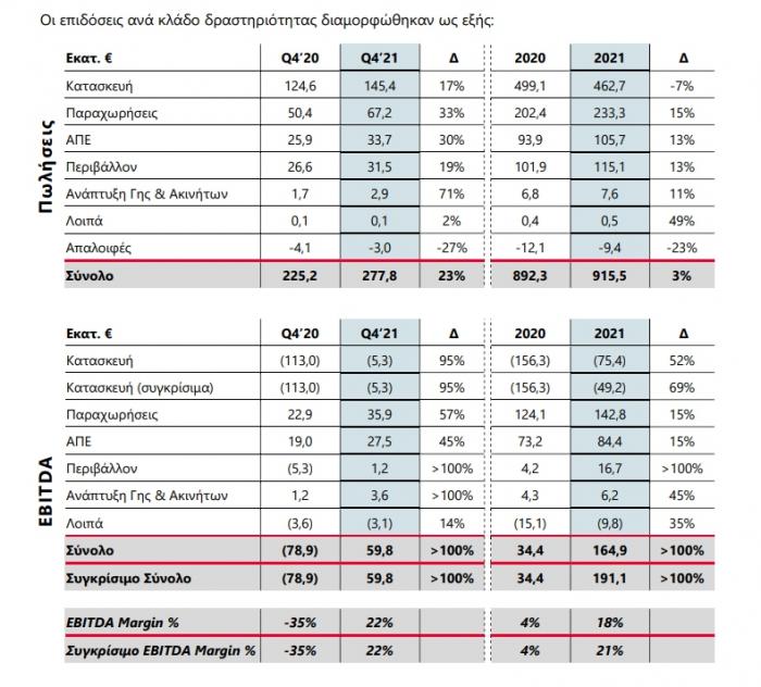 Σημαντική ενίσχυση της Λειτουργικής Κερδοφορίας για τη χρήση 2021, με EBITDA στα €164,9 εκατ., έναντι €34,4 εκατ. στη χρήση 2020 και περιθώριο EBITDA 18% έναντι 4%. Τα αποτελέσματα έχουν επιβαρυνθεί με ζημιά ποσού €26,2 εκατ. από σχηματισμό πρόβλεψης, σχετικά με αρνητική έκβαση διαιτησίας για έργο στο Κατάρ. Χωρίς αυτή την επιβάρυνση η λειτουργική κερδοφορία του Ομίλου διαμορφώνεται ως εξής: