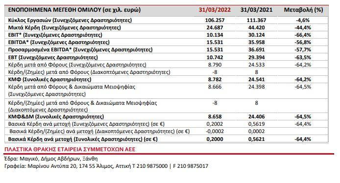 Σκοπός του παρόντος είναι να παρουσιάσει τα οικονομικά αποτελέσματα του πρώτου τριμήνου 2022 του Ομίλου Πλαστικά Θράκης.