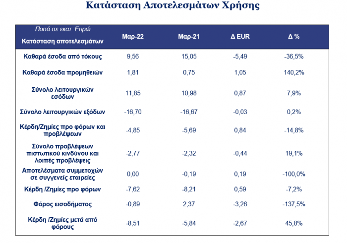 Εμφάνισε καθαρά έσοδα από τόκους ύψους 9,5 εκατ. ευρώ έναντι 15 εκατ. ευρώ πέρυσι. Τα καθαρά έσοδα από τόκους είναι μειωμένα κατά 36,5% σε σχέση με την αντίστοιχη συγκριτική περίοδο του 2021. Η αρνητική επίδραση σχετίζεται κυρίως με τη μείωση του επιτοκιακού εσόδου κατά 21,9% από δάνεια και απαιτήσεις κατά πελατών συνέπεια μεγάλων αποπληρωμών και κατά τη διάρκεια του α΄ τριμήνου του 2022, και από την μείωση της συνεισφοράς τόκων από ΜΕΑ.