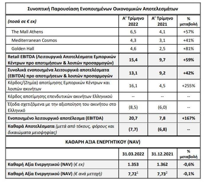 Τα κέρδη EBITDA των Εμπορικών Κέντρων The Mall Athens, Golden Hall και Mediterranean Cosmos το Α’ Τρίμηνο 2022 ανήλθαν σε €15,4 εκατ., αυξημένα κατά 59% έναντι του 2021.