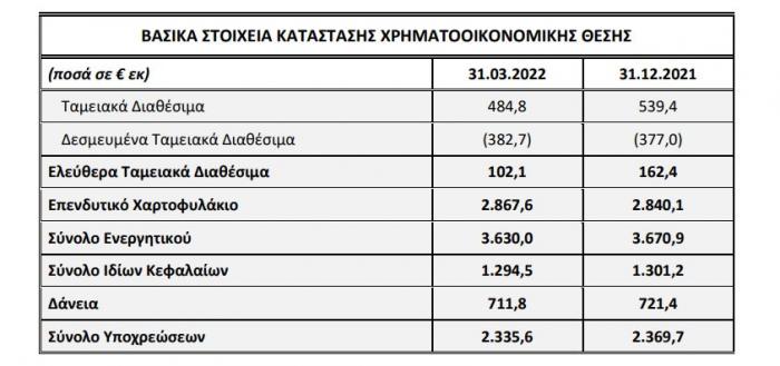 Η Καθαρή Αξία Ενεργητικού (NAV) την 31.03.2022 ανήλθε σε €1.353 εκατ. (ήτοι €7,72 ανά μετοχή), οριακά χαμηλότερα (-0,6%) έναντι της 31.12.2021. Επισημαίνεται ότι τόσο τα ενοποιημένα οικονομικά αποτελέσματα όσο και η Καθαρή Αξία Ενεργητικού (NAV) περιλαμβάνουν τη θετική επίπτωση ποσού €16,1 εκατ. που προήλθε από την επανεκτίμηση, από ανεξάρτητο εκτιμητή, της αξίας των Επενδυτικών Ακινήτων του Ομίλου (σημειώνεται ότι δεν πραγματοποιήθηκε επανεκτίμηση, από ανεξάρτητο εκτιμητή, της αξίας των Επενδυτικών Ακινήτων που περιλαμβάνονται στην ΕΛΛΗΝΙΚΟ Α.Ε. την 31.03.2022, καθώς η προγραμματισμένη επανεκτίμηση είναι την 30.06.2022).
