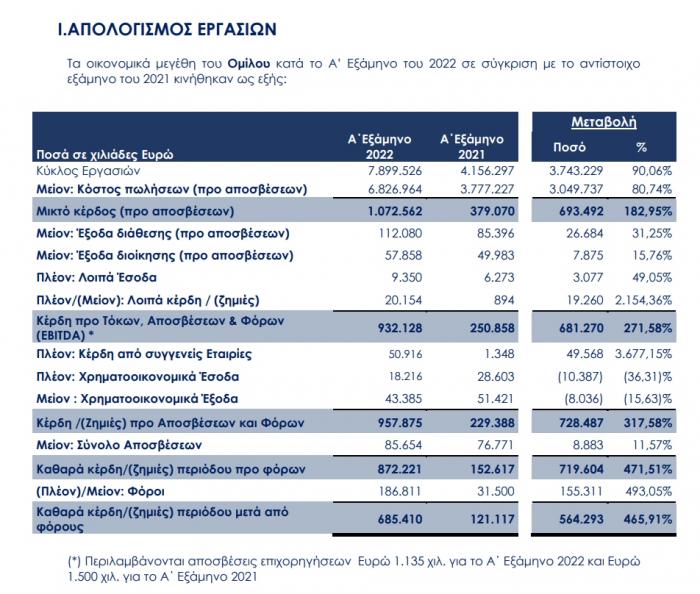 Τα κέρδη μετά από φόρους του Ομίλου διαμορφώθηκαν το Α’ εξάμηνο 2022 σε 685.410 χιλ. έναντι κερδών 121.117 χιλ. το Α’ εξάμηνο 2021.