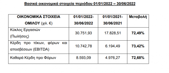 Η σημαντική αύξηση των οικονομικών μεγεθών του ομίλου στο πρώτο εξάμηνο (παρά τις ιδιαίτερες & απαιτητικές συνθήκες που έχουν δημιουργηθεί στην παγκόσμια & ελληνική οικονομία), επιβεβαιώνει την εκτίμηση της διοίκησης για αύξηση κατά +50% των ετήσιων εσόδων του ομίλου για το 2022 έναντι του 2021 και επίτευξη περιθωρίου EBITDA σε ετήσια βάση, υψηλότερο του 30%.
