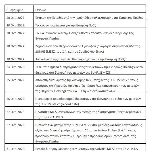 Επιπλέον, η Πειραιώς Holdings ανακοινώνει ότι στις 20.10.2022, η Επιτροπή Λειτουργίας Αγορών του Χρηματιστηρίου Αξιών Αθηνών ενέκρινε την εισαγωγή προς διαπραγμάτευση των μετοχών της SUNRISEMEZZ στην κατηγορία διαπραγμάτευσης της Εναλλακτικής Αγοράς EN.A. PLUS του Χρηματιστηρίου Αθηνών («EN.A. PLUS»), υπό την προϋπόθεση ολοκλήρωσης της ανωτέρω Εταιρικής Πράξης της Πειραιώς Holdings («Ένταξη»). Σύμβουλος ΕΝ.Α. για την Ένταξη είναι η Τράπεζα Πειραιώς («Σύμβουλος ΕΝ.Α.»).»