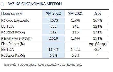 Ο κύκλος εργασιών διαμορφώθηκε σε 4.573 εκατ. έναντι 1.698 εκατ. στο Εννεάμηνο του 2021, σημειώνοντας αύξηση 169%. Τα Κέρδη προ Φόρων, Τόκων και Αποσβέσεων (EBITDA) αυξήθηκαν κατά 121% στα 533 εκατ. έναντι 241 εκατ. την αντίστοιχη περίοδο του προηγούμενου έτους, επωφελούμενα από τις ιστορικά υψηλές επιδόσεις των δραστηριοτήτων σε μεταλλουργία και «πράσινη» ενέργεια.