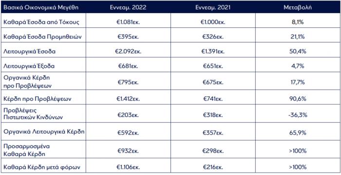 Ως αποτέλεσμα των ανωτέρω, τα οργανικά λειτουργικά κέρδη προ φόρων αυξήθηκαν κατά 65,9% σε €592εκ. το εννεάμηνο 2022, από €357εκ. το εννεάμηνο 2021.