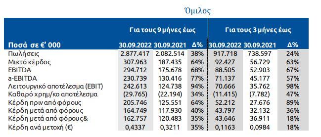 Τα ενοποιημένα μικτά κέρδη ανήλθαν στα 308,0 εκ. ευρώ το εννεάμηνο του 2022 έναντι 187,4 εκ. ευρώ την αντίστοιχη περίοδο του 2021 ενώ τα ενοποιημένα κέρδη προ φόρων, τόκων και αποσβέσεων (EBITDA) διαμορφώθηκαν στα 294,7 εκ. ευρώ έναντι 175,7 εκ. ευρώ για την αντίστοιχη περυσινή περίοδο.