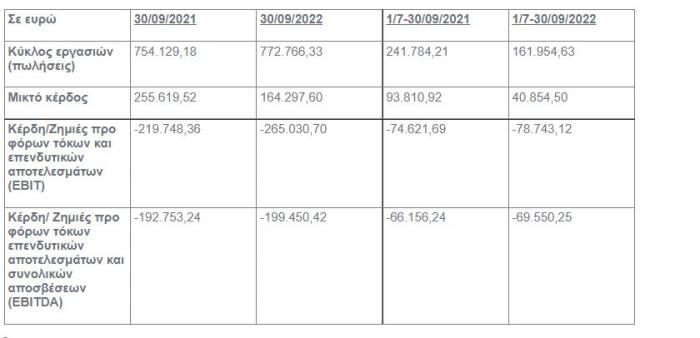 Ο κύκλος εργασιών της εταιρείας διαμορφώθηκε σε 772.766 ευρώ σημειώνοντας άνοδο έναντι του περυσινού εννεάμηνου που είχε ανέλθει στις 754.129 ευρώ, παρά το γεγονός ότι ο τζίρος του τρίτου τριμήνου ήταν σημαντικά μειωμένος έναντι της περασμένης χρονιάς καθώς ανήλθε στα 161.954 ευρώ το 2022 από 241.784 ευρώ που ήταν στο αντίστοιχο τρίμηνο του 2021.