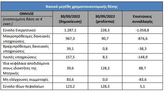 Στον κατωτέρω πίνακα παρουσιάζονται οι επιπτώσεις της ανωτέρω προτεινόμενης συναλλαγής παραθέτοντας τα βασικά μεγέθη της χρηματοοικονομικής θέσης του Ομίλου κατά την 30/09/2022 σε ενοποιημένη βάση, συγκρινόμενα με τα proforma μεγέθη εξαιρουμένων των στοιχείων του ομίλου ATTICA και των δανειακών υποχρεώσεων της Εταιρείας.