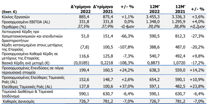 Στα 3,45 δισ. ευρώ ανήλθε ο κύκλος εργασιών του ομίλου σημειώνοντας άνοδο 3,6% έναντι των 3,33 δισ. ευρώ το 2021, με το προσαρμοσμένο EBITDA που παρέμεινε σταθερό στο δ΄τρίμηνο του έτους να διαμορφώνεται στα 1,34 δισ. ευρώ σημειώνοντας άνοδο 4% από τα 1,29 δισ. το 2021.