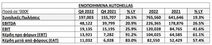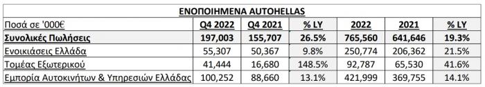 Νέο ρεκόρ εμφάνισαν τόσο οι ενοποιημένες πωλήσεις όσο και τα κέρδη μετά φόρων της AutoHellas για το 2022, όπως σημειώνει η εταιρεία σε ανακοίνωσή της, καθώς έφθασαν στα 765,6 εκατ. και 82,5 εκατ. ευρώ αντίστοιχα. Παράλληλα ο όμιλος θα προχωρήσει στην καταβολή μερίσματος 0,65 ευρώ ανά μετοχή.