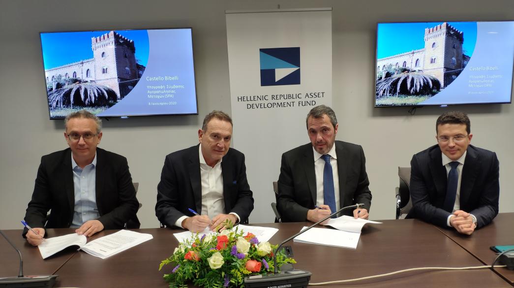Ο Εκτελεστικός Πρόεδρος του ΤΑΙΠΕΔ, κ.Άρης Ξενόφος και οι κ.κ. Σάμ Φάις, Πρόεδρος & Διευθύνων Σύμβουλος και Χαράλαμπος Πανδής, Αντιπρόεδρος της Castello Bibelli AE υπέγραψαν σήμερα τη Σύμβαση Αγοροπωλησίας Μετοχών (SPA). Παράλληλα, επήλθε και το οικονομικό κλείσιμο της συναλλαγής, με την καταβολή της πρώτης δόσης, ύψους 1,550 εκατ. ευρώ από το συνολικό οικονομικό τίμημα των 4.111.505 ευρώ.