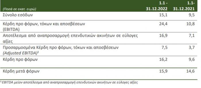 Όπως ανακοίνωσε η εισηγμένη παρυσίασε αύξηση εσόδων κατά 58% και διπλασιασμός λειτουργικής κερδοφορίας (Adjusted EBITDA), σε ενοποιημένη βάση, σε σχέση με το 2021. Διατήρηση ισχυρής καθαρής κερδοφορίας, με τα ενοποιημένα κέρδη μετά φόρων να διαμορφώνονται σε 15,9 εκατ. ευρώ για το 2022.