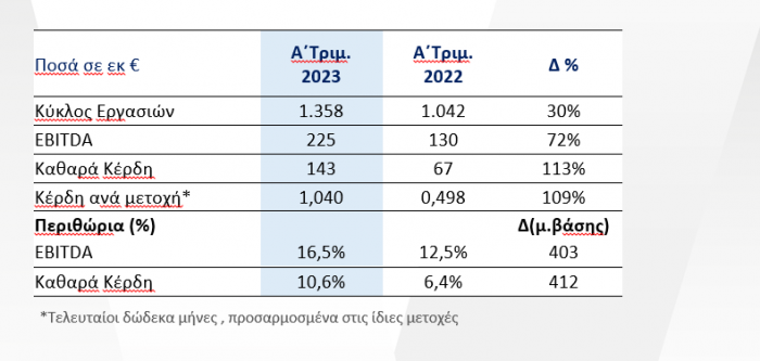 O κύκλος εργασιών αυξήθηκε σε €1.358 εκατ. έναντι €1.042 εκατ. στο Α’ τρίμηνο του 2022, σημειώνοντας αύξηση 30% παρά την σημαντική αποκλιμάκωση των τιμών ενέργειας και μετάλλων. Τα Κέρδη προ Φόρων, Τόκων και Αποσβέσεων (EBITDA) σημείωσαν επίσης σημαντική αύξηση κατά 72% στα €225 εκατ. έναντι €130 εκατ. την αντίστοιχη περίοδο του προηγούμενου έτους, επωφελούμενα από τη συνεχή διεθνοποίηση των δραστηριοτήτων της εταιρείας που έχει ως αποτέλεσμα τις ταυτόχρονα ισχυρές επιδόσεις των Κλάδων Ενέργειας και Μεταλλουργίας και την περαιτέρω διεύρυνση του περιθωρίου κέρδους.