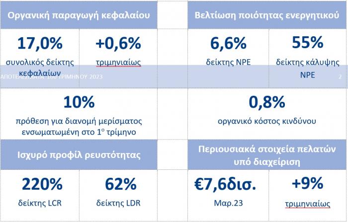Η οργανική παραγωγή κεφαλαίου το 1ο τρίμηνο οδήγησε τον δείκτη CET1 στο 12,2%, αυξημένο κατά 0,6% σε τριμηνιαία βάση και κατά περίπου 2,4% τους τελευταίους 12 μήνες. Περαιτέρω, είμαστε στην ευχάριστη θέση να έχουμε τη δυνατότητα από το 1ο τρίμηνο, να συμπεριλάβουμε πρόβλεψη για 10% διανομή μερίσματος, ώστε να θέσουμε τις βάσεις για διανομή στους μετόχους μας από τα κέρδη του 2023.