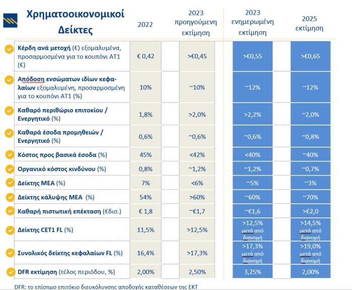 Αξιοποιώντας τις επιδόσεις μας και το ενθαρρυντικό μακροοικονομικό περιβάλλον, αναβαθμίζουμε τους βασικούς χρηματοοικονομικούς μας στόχους για φέτος. Συγκεκριμένα, στοχεύουμε πλέον σε απόδοση ενσώματων ιδίων κεφαλαίων 12%, με τον δείκτη κόστος προς βασικά έσοδα κάτω του 40%. Τα νέα δάνεια αναμένεται να αυξηθούν κατά €1,6 δισ.