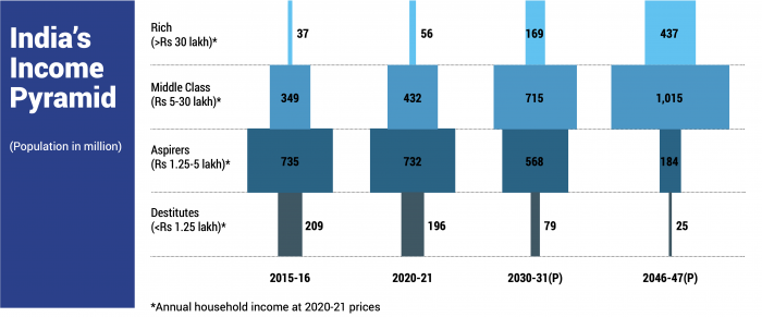 Υπολογίζεται επίσης ότι ο πληθυσμός των απόρων με ετήσιο εισόδημα λιγότερο από 1.400 ευρώ και των φιλόδοξων ομάδων με εισόδημα μεταξύ 1.400 και 5.500 ευρώ, θα μειωθεί από σχεδόν 928 εκατομμύρια το 2020-2021 σε 647 εκατομμύρια έως το 2030-31 και περαιτέρω 209 εκατομμύρια έως το 2046-47. Αντίθετα το κορυφαίο εισοδηματικό τμήμα, οι πλούσιοι, θα εκτιναχθεί από 56 εκατομμύρια σε 169 εκατομμύρια και 437 εκατομμύρια, κατ' εκτίμηση.