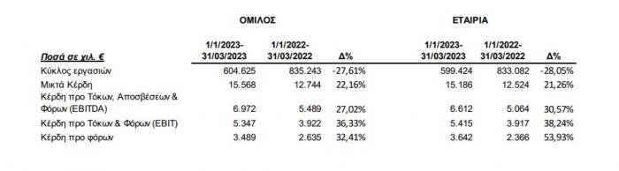 Το ενοποιημένο προ φόρων αποτέλεσμα 01/01-31/03/2023 ανήλθε σε κέρδος 3.489 χιλ., σε σύγκριση με κέρδος 2.635 χιλ. την αντίστοιχη περίοδο του 2022.