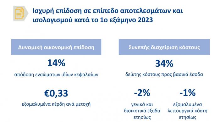 Για το α' εξάμηνο καταγράφηκε ισχυρή κερδοφορία με εξομαλυμένα κέρδη ανά μετοχή €0,33 και RoaTBV 14%