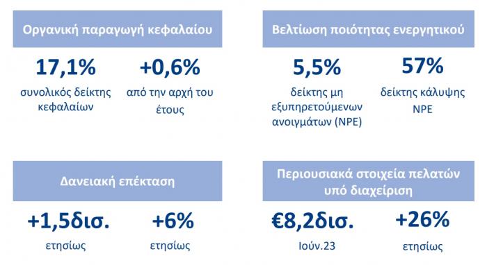 Ο δείκτης CET1 ενισχύθηκε στο 12,2% και ο συνολικός δείκτης κεφαλαίων στο 17,0%, τον Ιούνιο 2023. Σε pro forma επίπεδο για τη μείωση σταθμισμένων βάσει κινδύνων στοιχείων ενεργητικού από τις πωλήσεις NPE που θα ολοκληρωθούν την προσεχή περίοδο, ο δείκτης CET1 διαμορφώθηκε στο 12,3% και ο συνολικός δείκτης κεφαλαίων στο 17,1%
