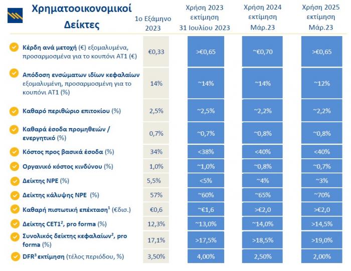 Με βάση τις ισχυρές επιδόσεις του 1ου εξάμηνου 2023 και το εξελισσόμενο περιβάλλον επιτοκίων, αναβαθμίζουμε τους βασικούς χρηματοοικονομικούς μας στόχους για το έτος 2023, στοχεύοντας πλέον σε απόδοση ενσώματων ιδίων κεφαλαίων περίπου 14%, με δείκτη κόστους προς βασικά έσοδα κάτω του 38%. Ο δείκτης ΝΡΕ αναμένεται να διαμορφωθεί κάτω από το επίπεδο ορόσημο του 5% στο τέλος του έτους 2023.