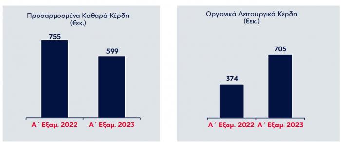 - Ως αποτέλεσμα των ανωτέρω, τα οργανικά λειτουργικά κέρδη προ φόρων αυξήθηκαν σε ετήσια βάση από €374εκ. σε €705εκ. το Α΄ εξάμηνο 2023.