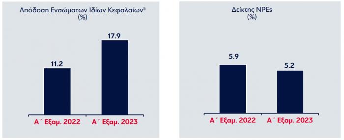 - Τα προσαρμοσμένα κέρδη προ φόρων διαμορφώθηκαν σε €712εκ. και τα προσαρμοσμένα καθαρά κέρδη σε €599εκ. το Α΄ εξάμηνο 2023. Τα κέρδη ανά μετοχή διαμορφώθηκαν σε €0,18 και η απόδοση των ενσώματων ιδίων κεφαλαίων5 ανήλθε σε 17,9% το Α΄ εξάμηνο 2023. Τα συνολικά καθαρά κέρδη διαμορφώθηκαν σε €684εκ., έναντι €941εκ. το Α΄ εξάμηνο 2022 και περιλαμβάνουν κυρίως €111εκ. κέρδος από την απόκτηση συμμετοχής στην Ελληνική Τράπεζα Κύπρου.