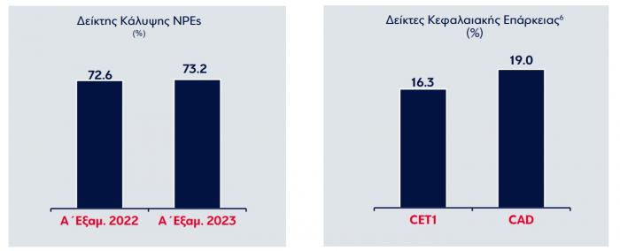 - Οι προβλέψεις επισφαλών απαιτήσεων αυξήθηκαν κατά 36,8% έναντι του Α΄ Εξαμήνου 2022 σε €164εκ. και αντιστοιχούσαν σε 81μονάδες βάσης επί των μέσων χορηγήσεων.