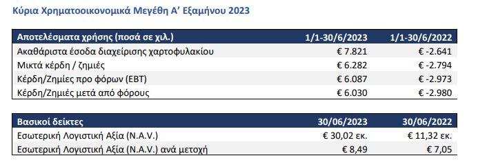 Για την περίοδο από 01/01/2023 έως 30/06/2023 το χαρτοφυλάκιο της Εταιρείας σημείωσε απόδοση 24,74% με την εσωτερική αξία του χαρτοφυλακίου (Ν.Α.V.) να ανέρχεται σε €30,02 εκατ. ή €8,49 ανά μετοχή στις 30/06/2023.
