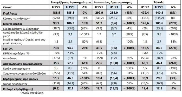 Όπως αναφέρει ο όμιλος στην ανακοίνωσή του, ο κύκλος εργασιών από συνεχιζόμενες δραστηριότητες διαμορφώθηκε στα 185,8 εκατ. ευρώ παραμένοντας σταθερός στα επίπεδα του αντίστοιχου περυσινού εξαμήνου, ενώ τα Κέρδη προ Φόρων Τόκων και Αποσβέσεων (EBITDA) ανήλθαν σε 94 εκατ. ευρώ το πρώτο εξάμηνο σημειώνοντας άνοδο 29% σε ετήσια βάση, με περιθώριο EBITDA Σ.Δ. στο 51%.